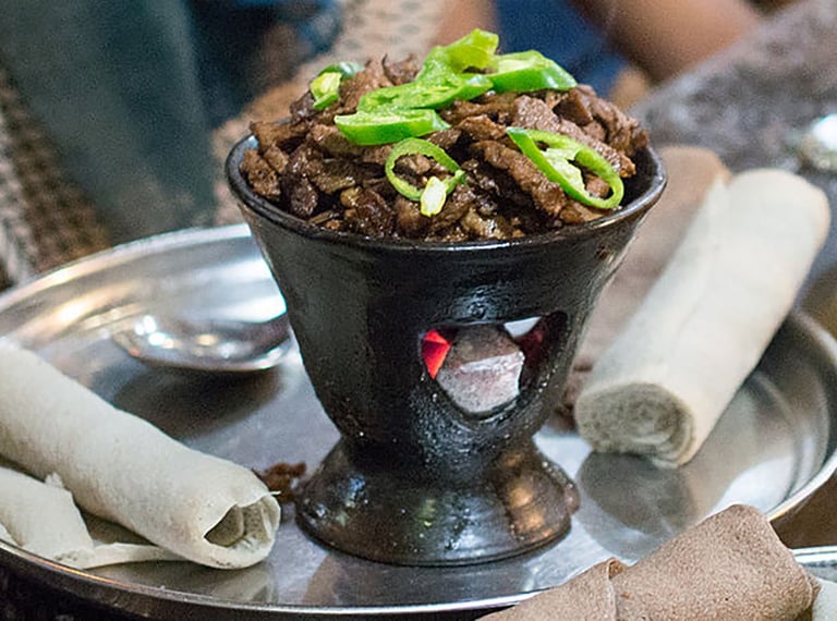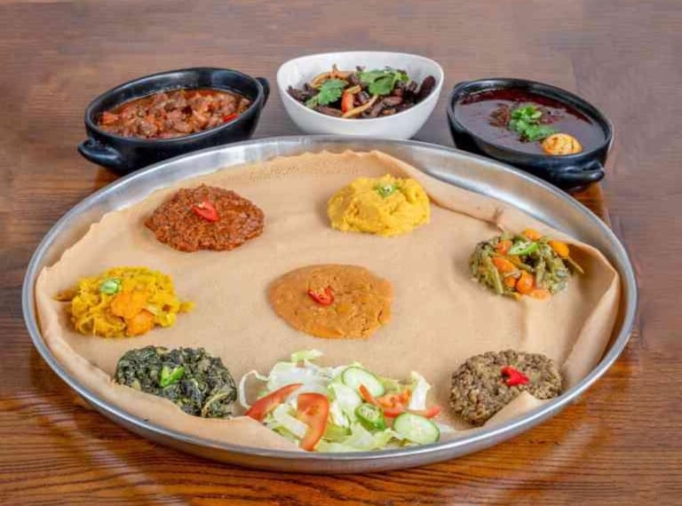 Combination of vegetables such as collard greens, cabbages, carrot, split peas, red lentils, string beans and injera.
