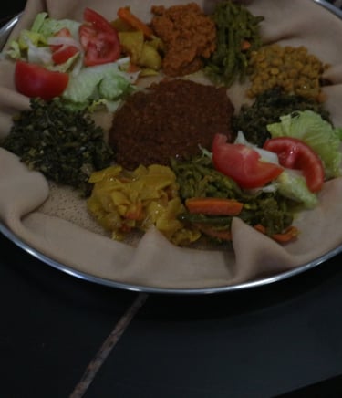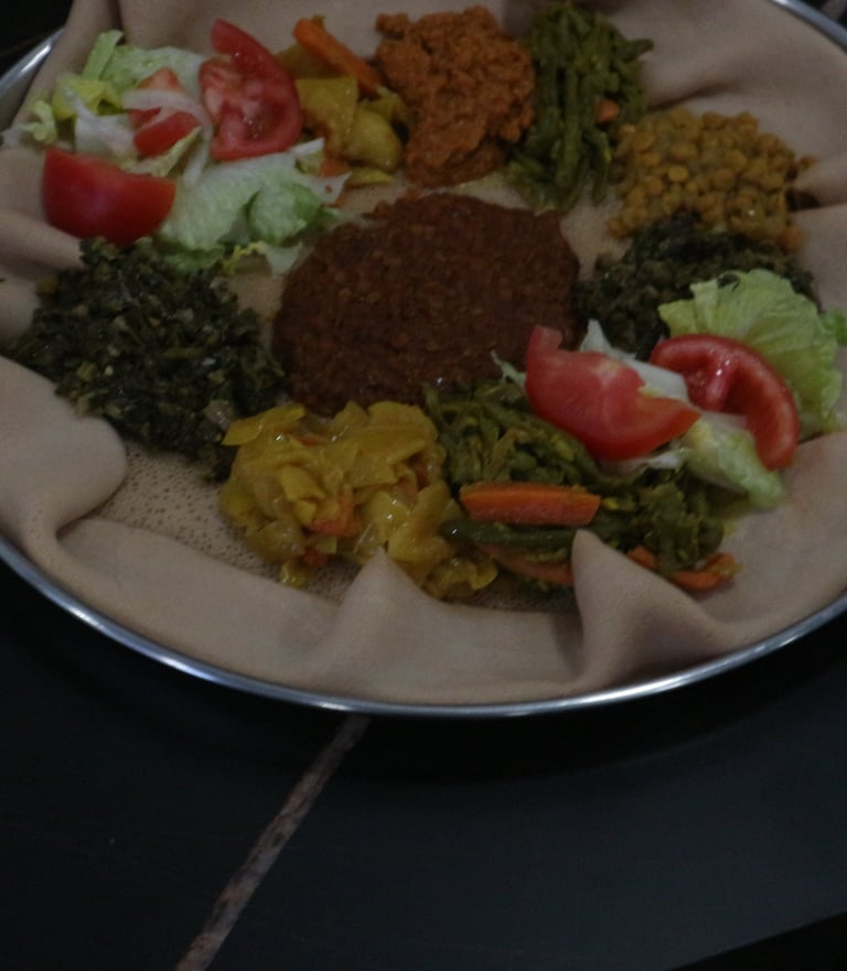 Combination of vegetables such as collard greens, cabbages, carrot, split peas, red lentils, string beans and injera.