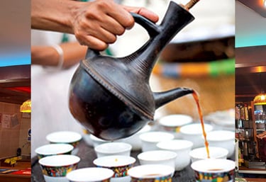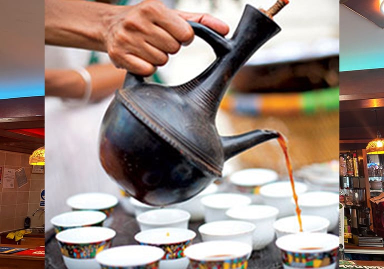 The Ethiopian Coffee Ceremony involves roasting, grinding, and brewing coffee, symbolizing hospitality and cultural tradition.