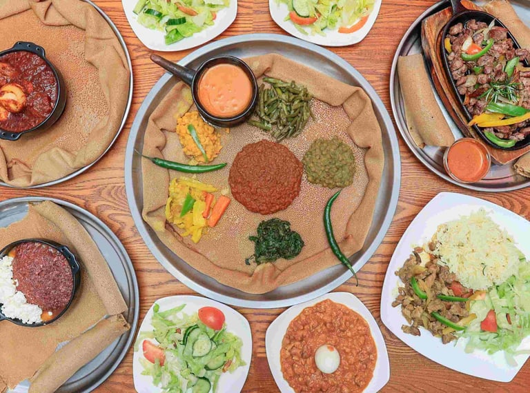 Combination of vegetables such as collard greens, cabbages, carrot, split peas, red lentils, string beans and injera.